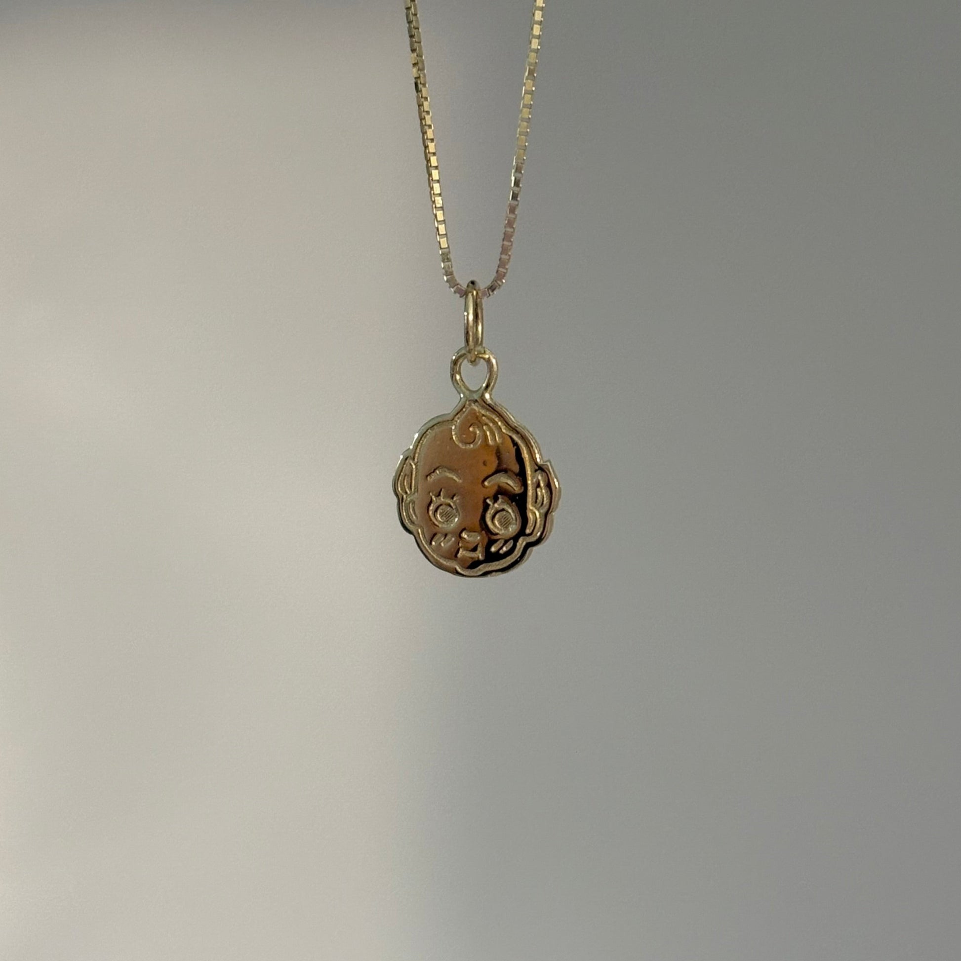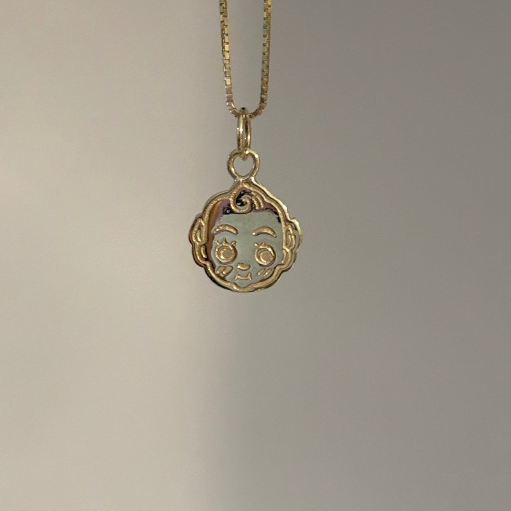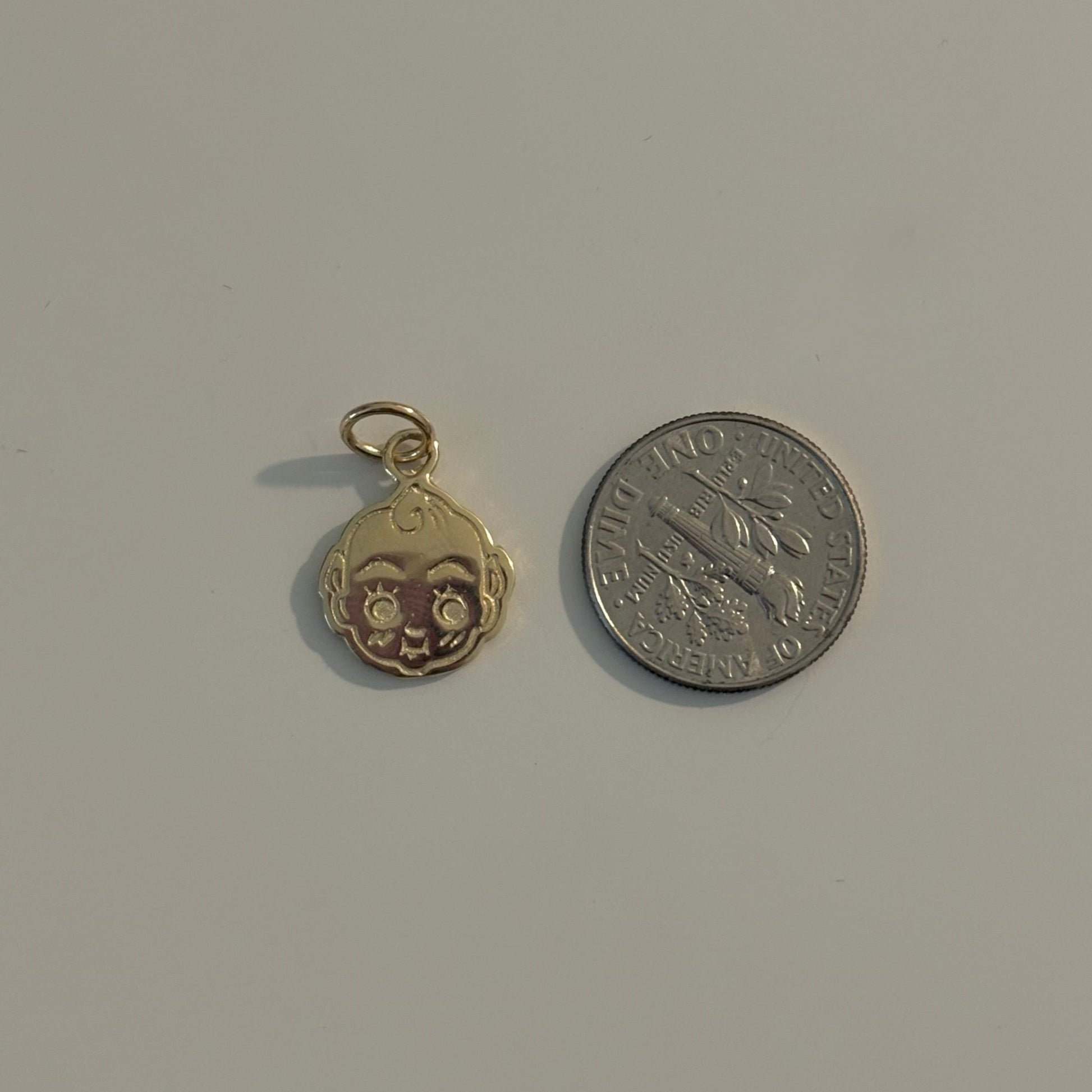 Charming, sweet, and full of personality, this solid 14K gold baby face charm is a playful nod to early 20th-century doll designs. With wide eyes, a soft expression, and a signature little curl, this piece adds a unique and joyful touch to any charm collection.