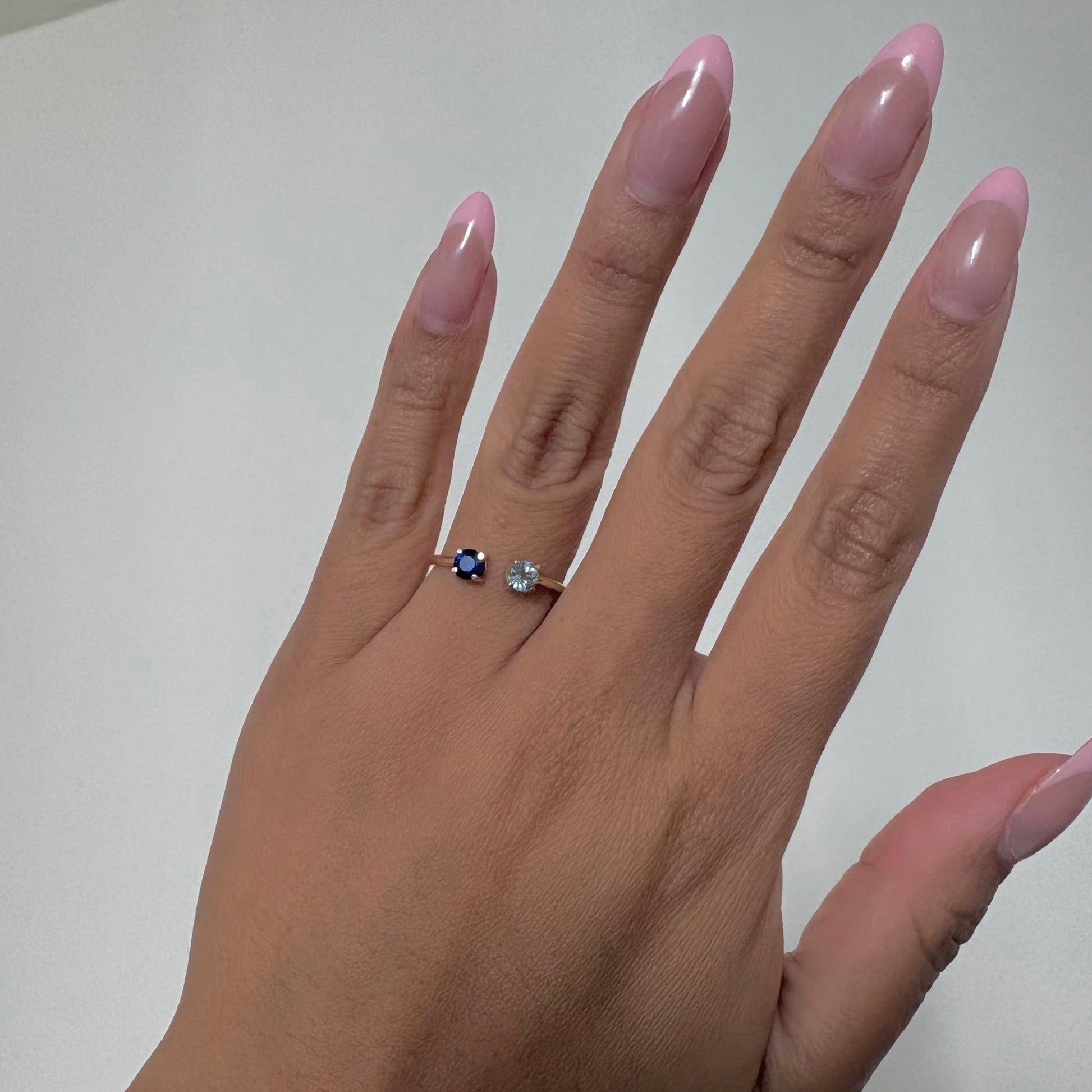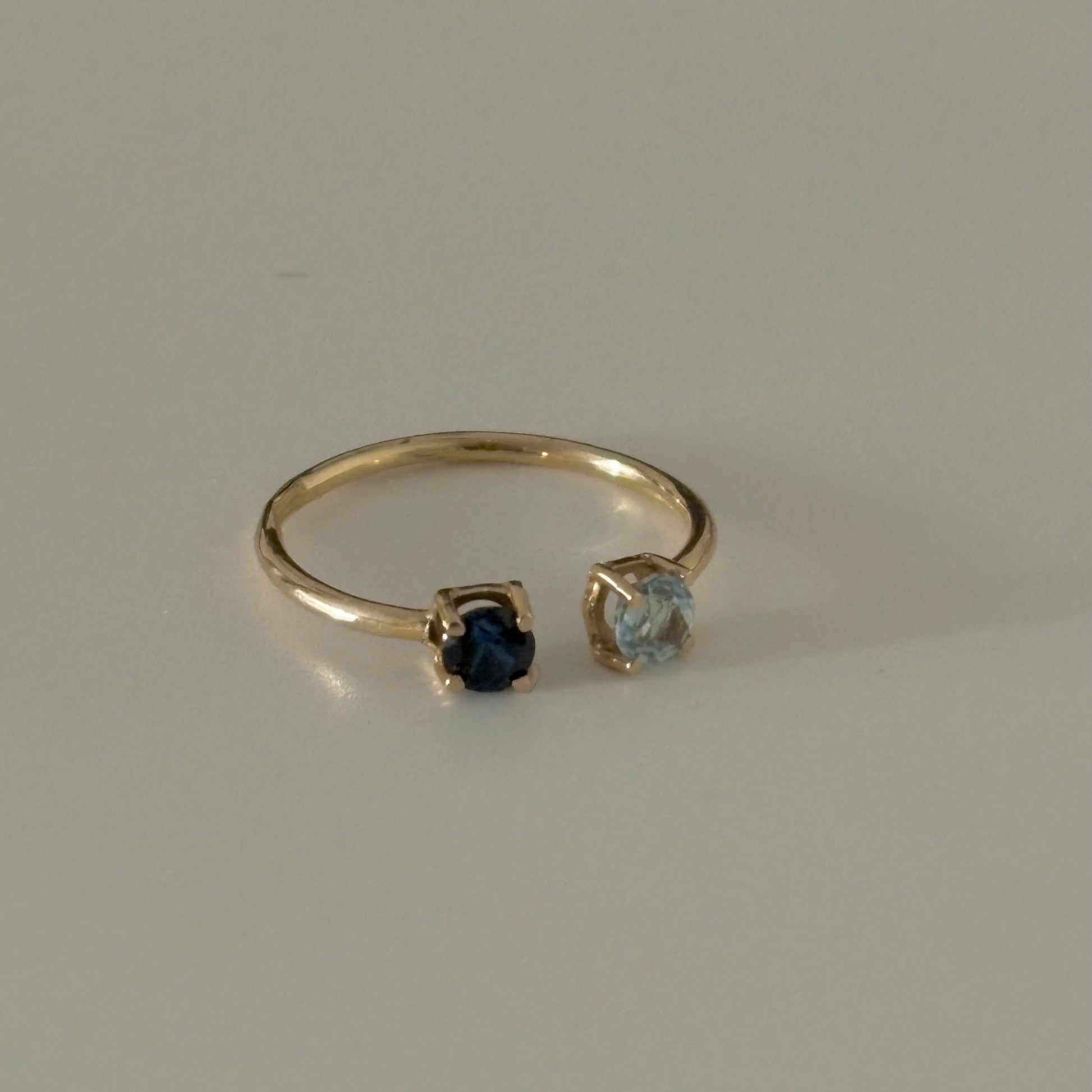 One side is set with a deep blue sapphire, while the other features a light blue aquamarine, creating a soft contrast of blue tones that feels timeless and refined. The stones are petite yet vibrant, making this ring perfect for everyday wear or stacking.