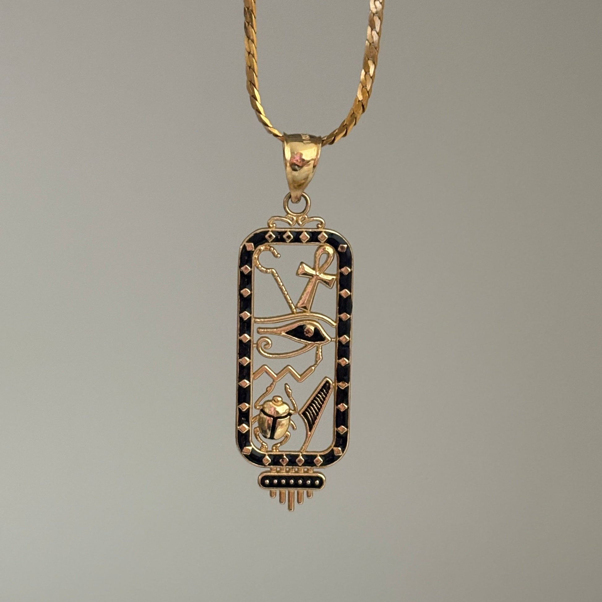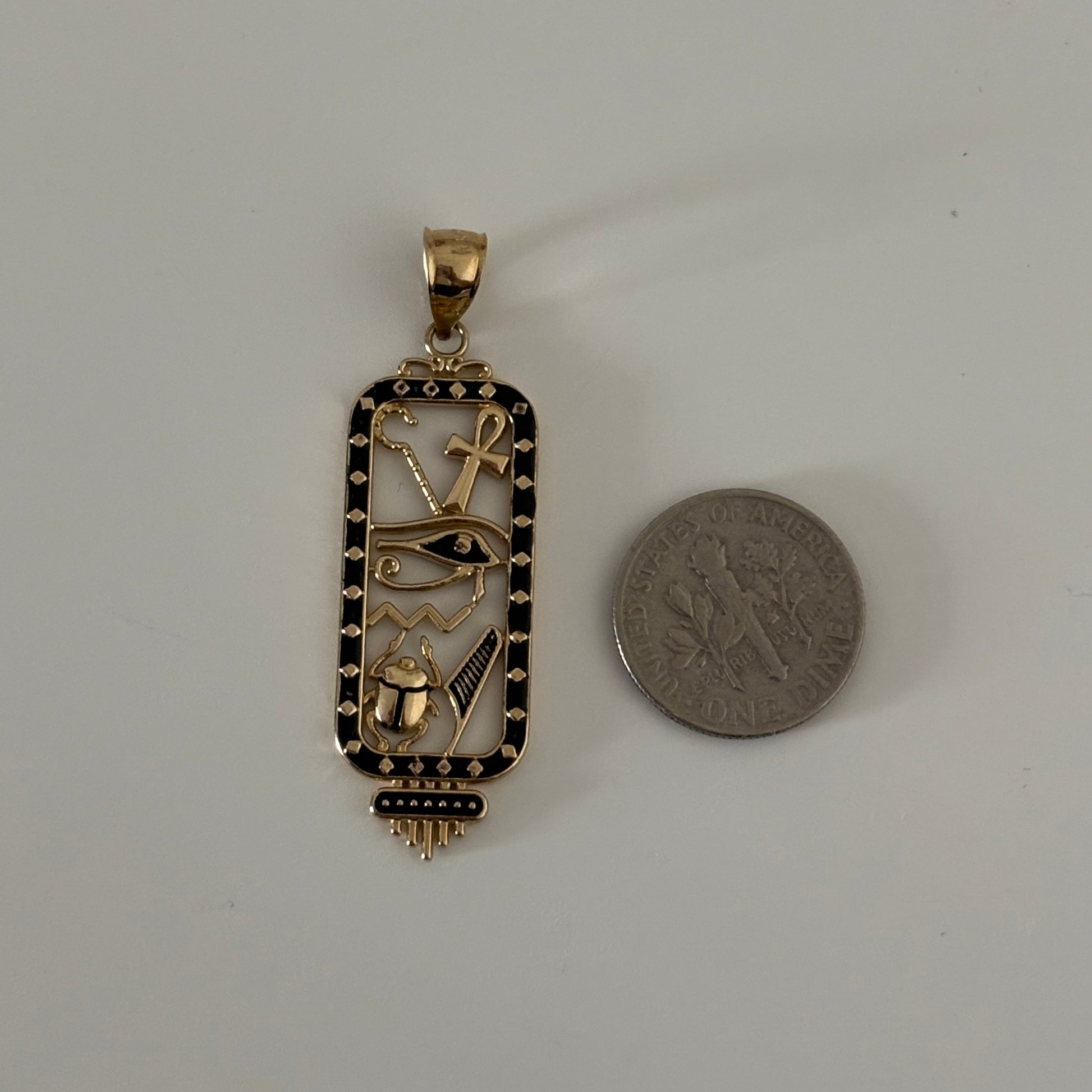 This solid 14K yellow gold cartouche charm features beautifully detailed hieroglyphic motifs — including the Ankh (symbol of life), Eye of Horus (protection & healing), and Scarab (rebirth & good fortune) — framed with elegant black enamel detailing along the border.