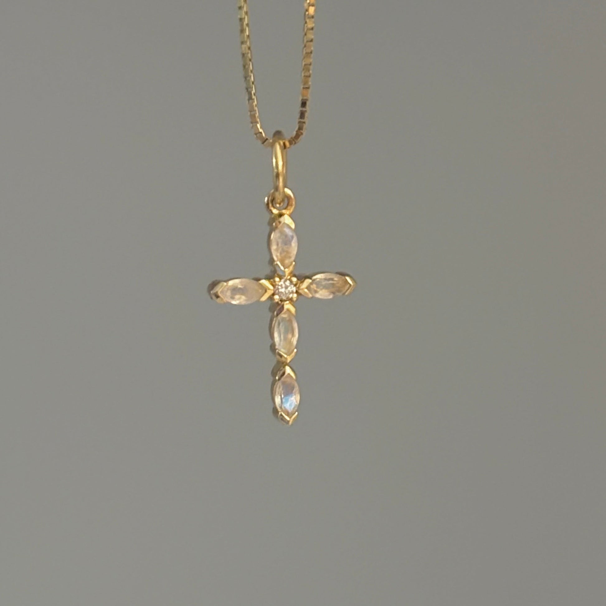 A delicate and radiant 14K gold cross pendant set with natural marquise-cut moonstones and a sparkling diamond at the center. The stones reflect soft flashes of light, giving this piece a serene and timeless beauty.