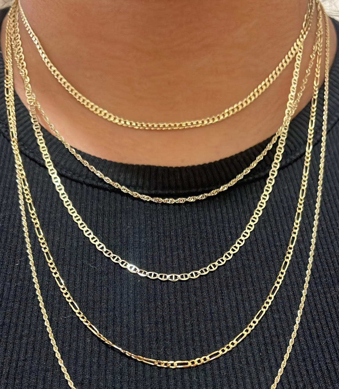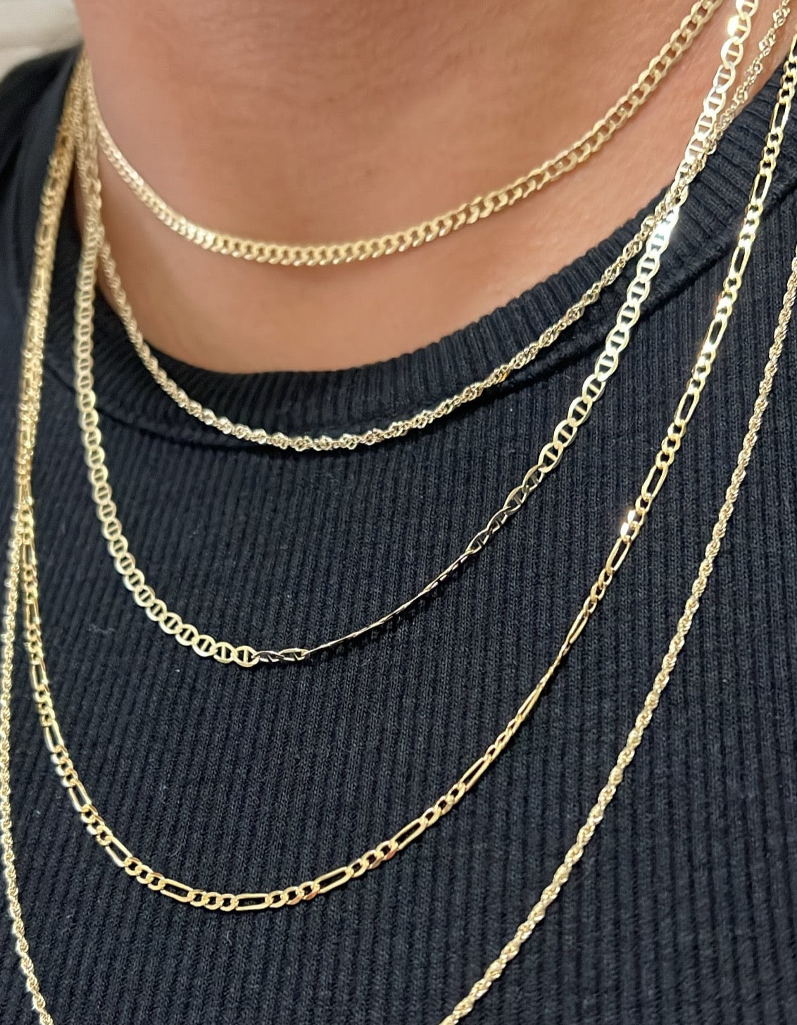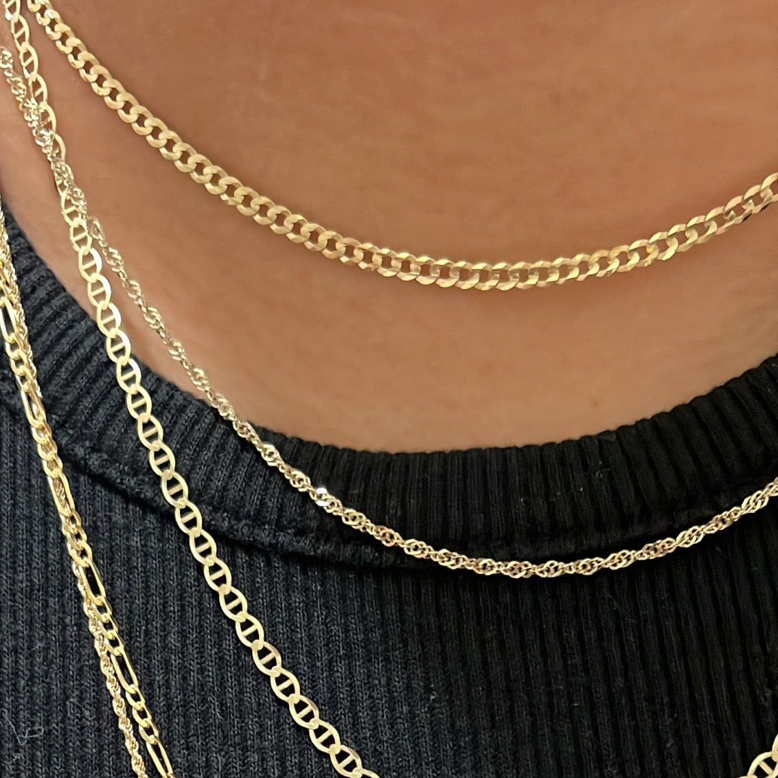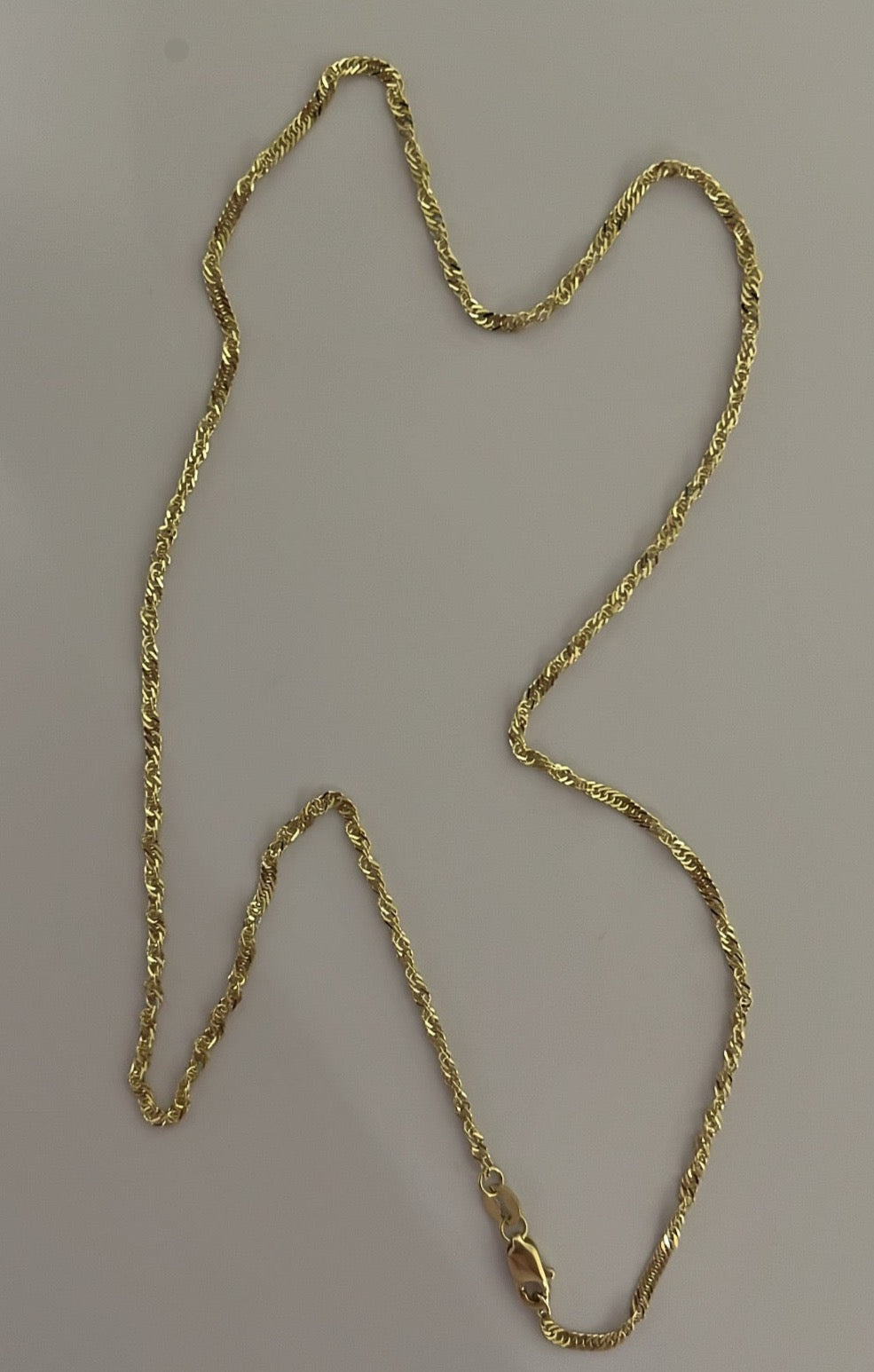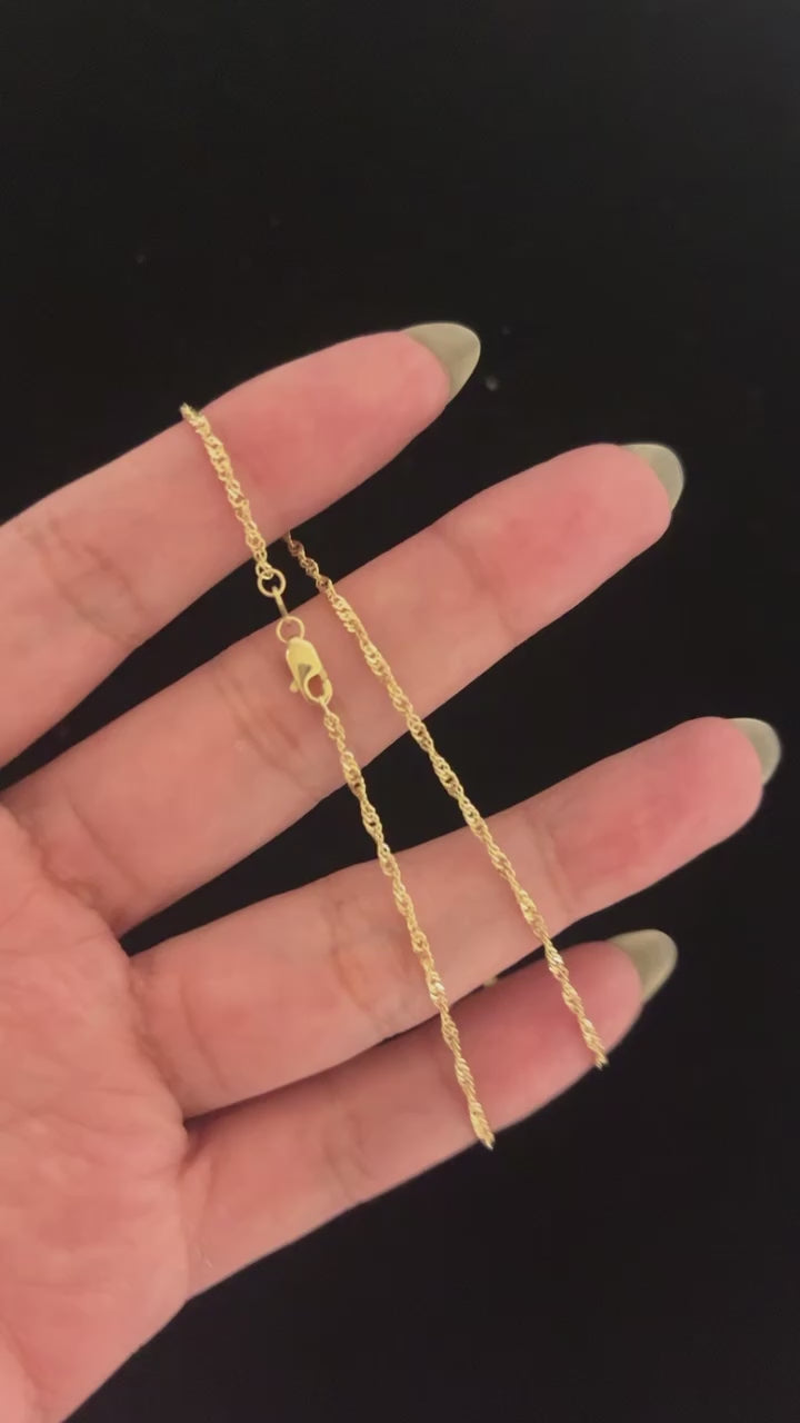 This solid 14K yellow gold Singapore chain features an elegant twisted design that dances in the light. At 1.8mm wide, it’s perfect for layering or wearing with small pendants — lightweight yet eye-catching.