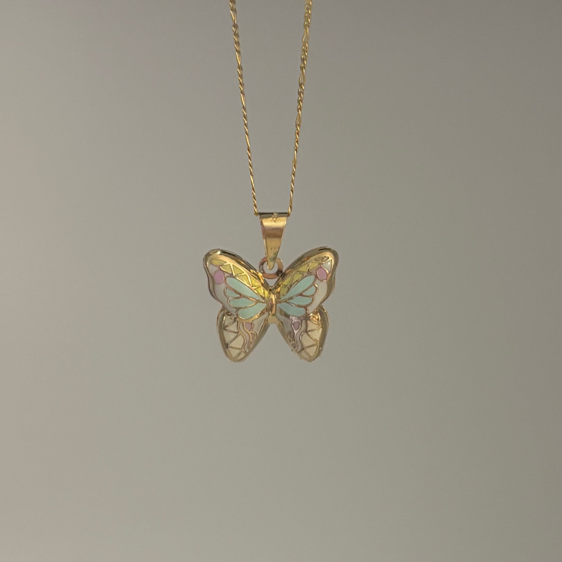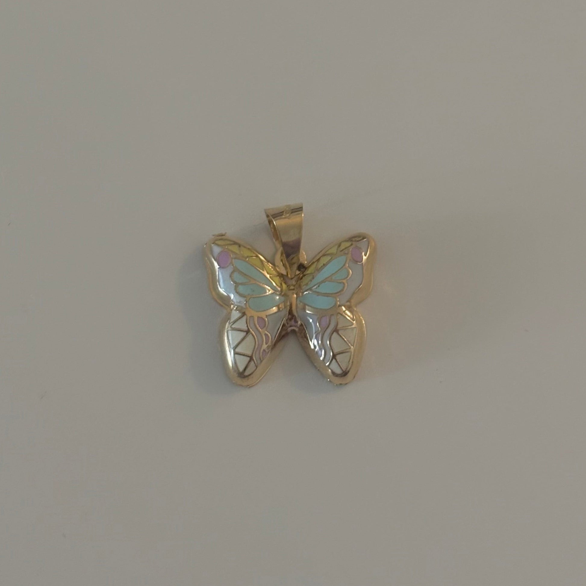 This charming puffy butterfly charm is crafted in solid 14K yellow gold and detailed with enamel accents in soft, light-toned shades of purple, white, and blue. The colors have a gentle, airy look, while the dimensional butterfly design adds depth and character.
