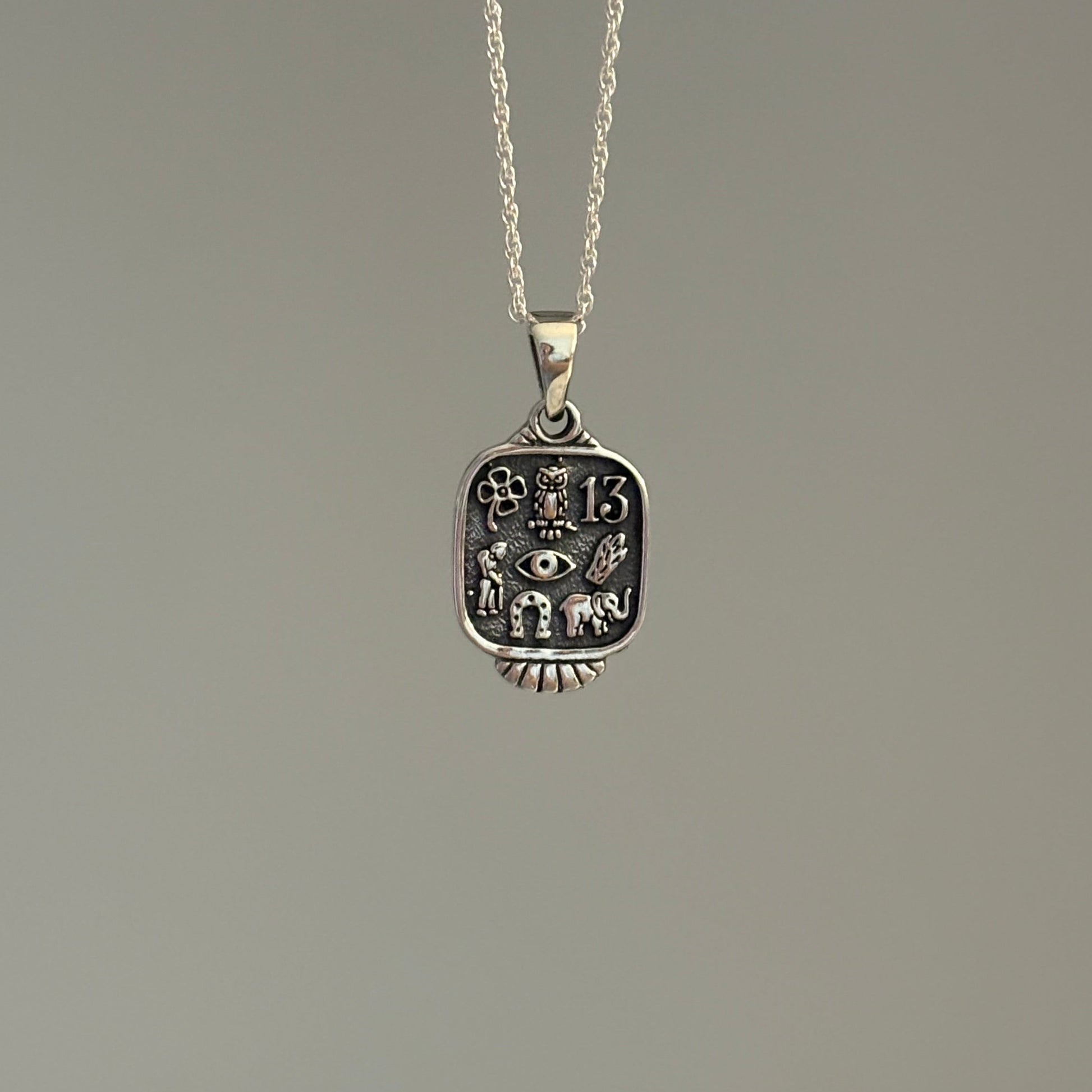 This sterling silver Good Luck pendant is full of charm and meaning. Crafted from 925 silver, it features traditional lucky symbols, including the number 13, an eye, a horseshoe, and more. The oxidized finish enhances the intricate details, giving it depth and character. A perfect talisman for everyday wear or as a thoughtful gift.