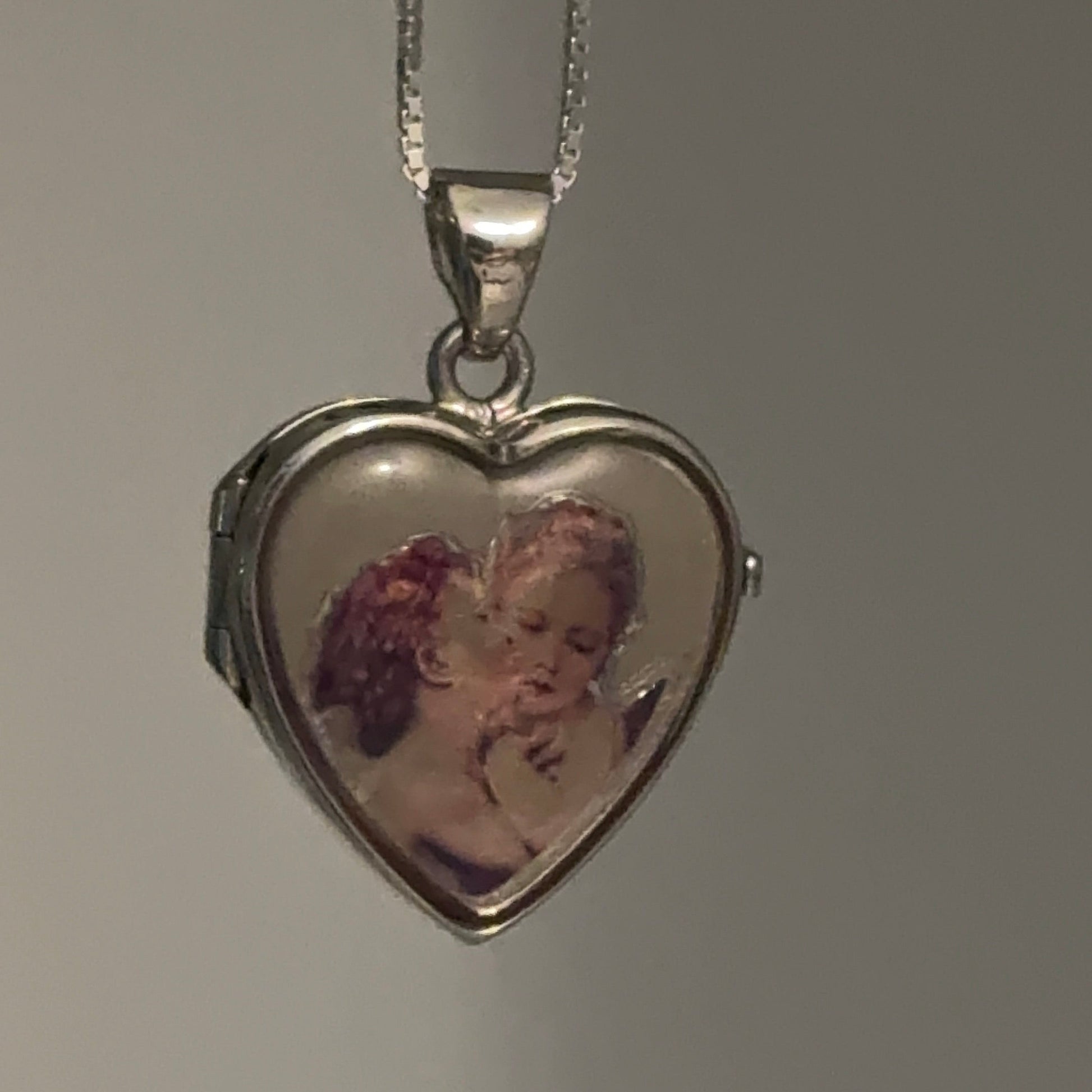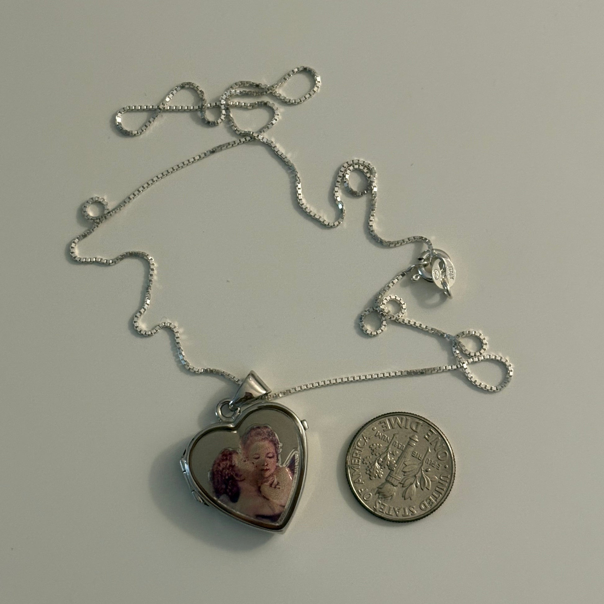 A romantic sterling silver Italian heart locket paired with an 18-inch box chain. The locket features a beautiful angel motif one angel sweetly kissing another a symbol of love, guidance, and protection. The image is set on the front beneath a glossy surface, giving it a vintage-inspired look. Nearly new and in excellent condition, this locket opens so you can place small photos or keepsakes inside. Both the locket and chain are stamped Italione 925, confirming genuine Italian silver craftsmanship.