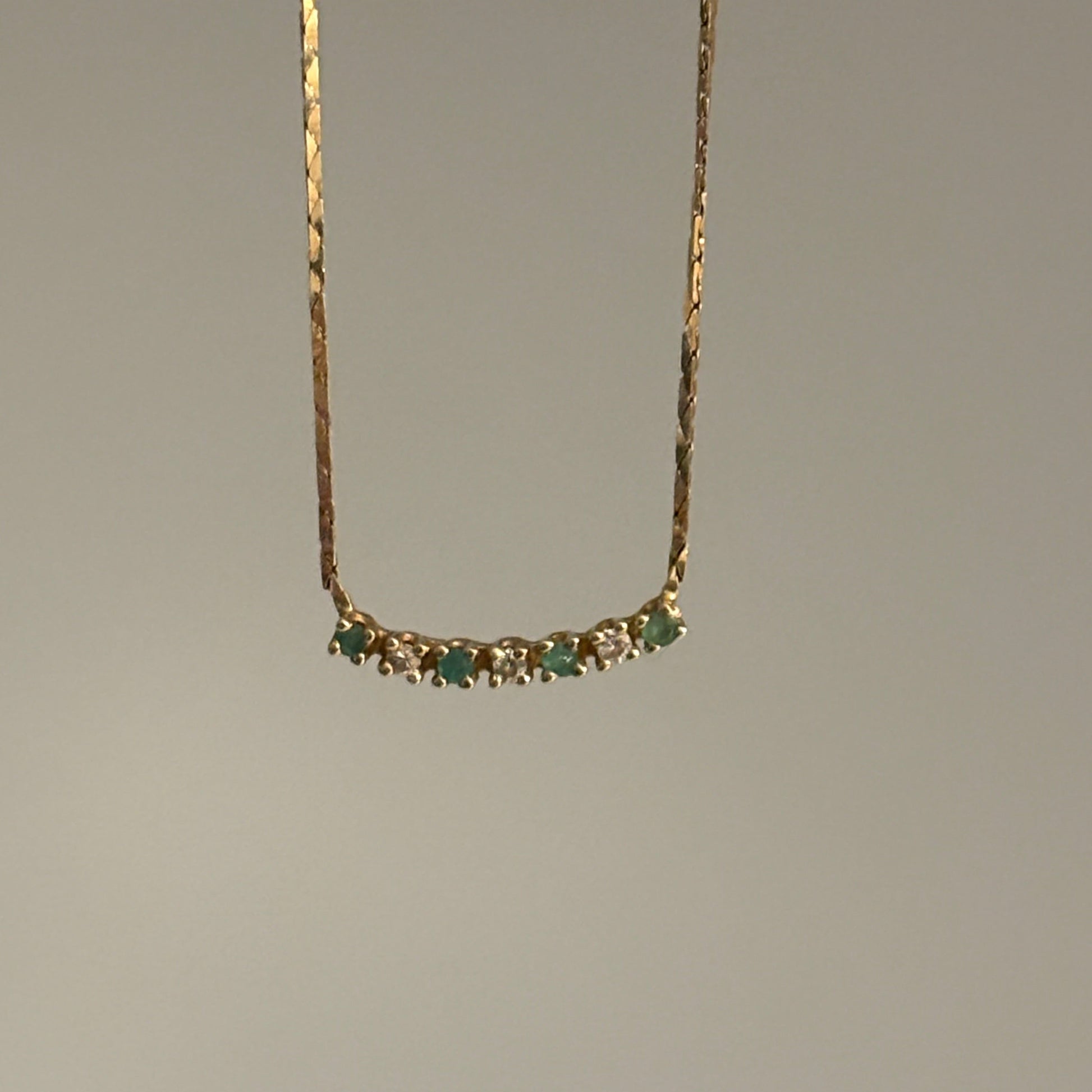 This vintage 14K gold necklace features a delicate bar design set with natural emeralds and diamonds. The combination of bright green emeralds and sparkling diamonds makes this piece both elegant and unique — a perfect gift or heirloom addition to your collection.