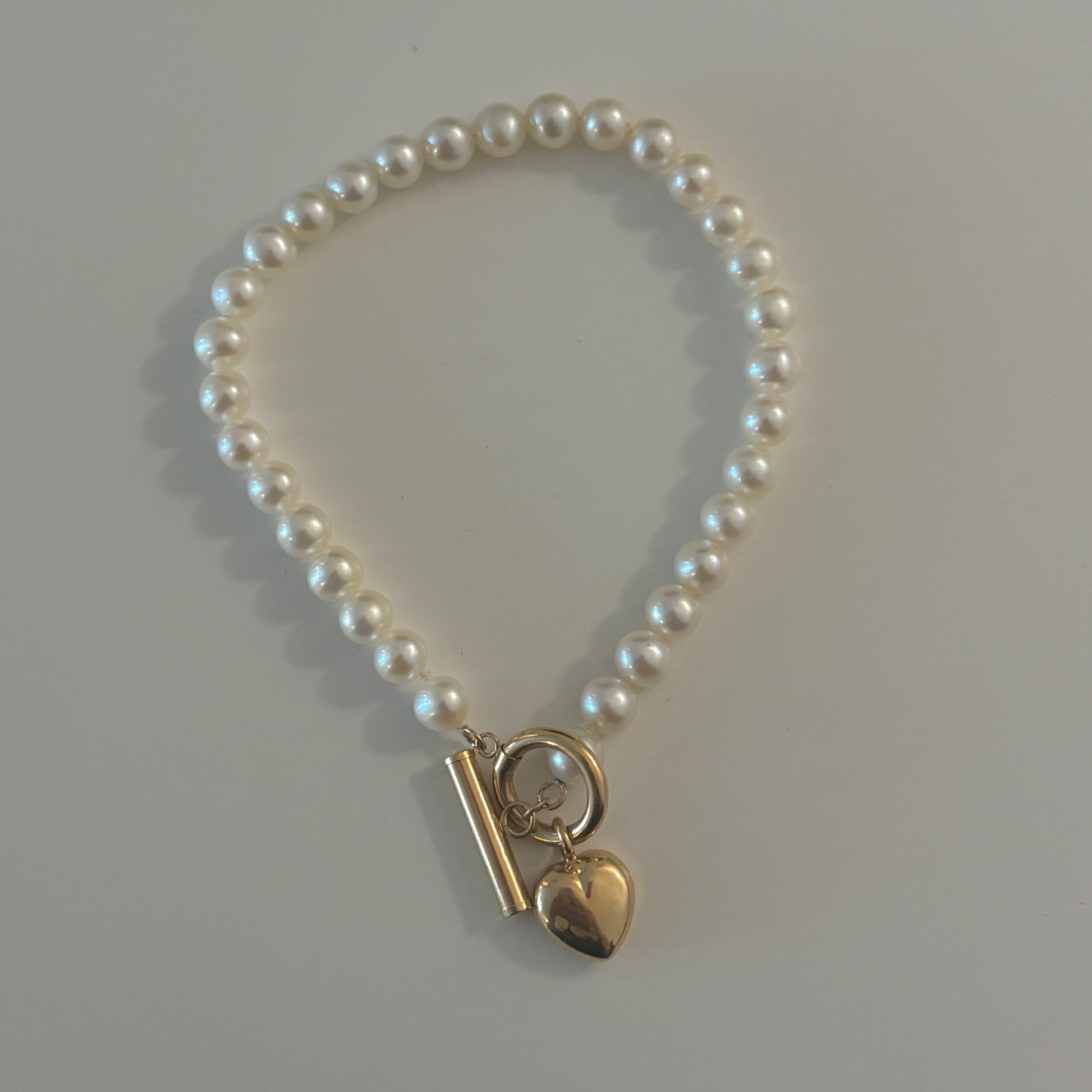 A timeless vintage freshwater pearl bracelet featuring luminous round pearls and a classic 14K gold toggle clasp with a dangling heart charm. Elegant and feminine, this piece has a beautiful balance of softness and vintage character, perfect for everyday wear or special occasions.