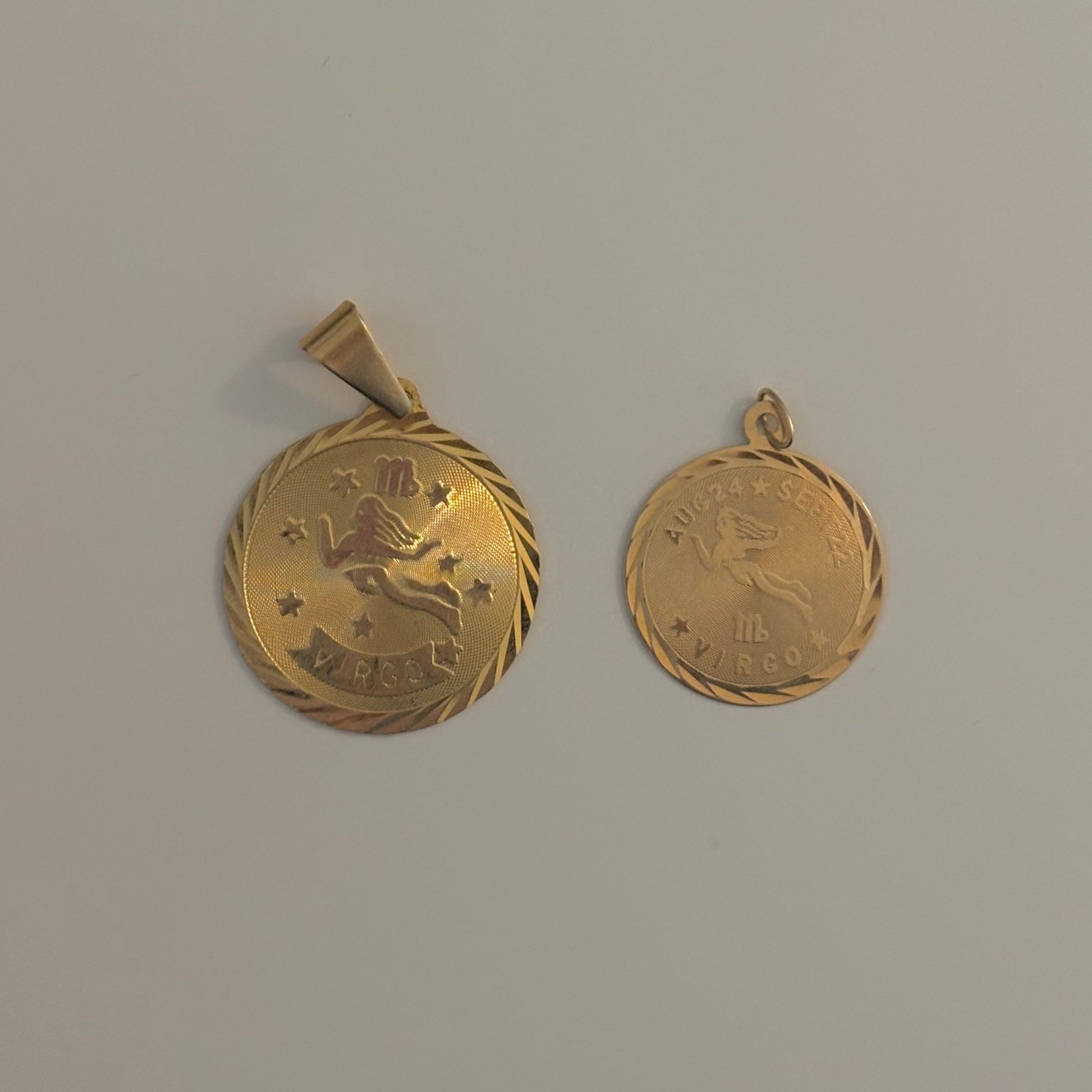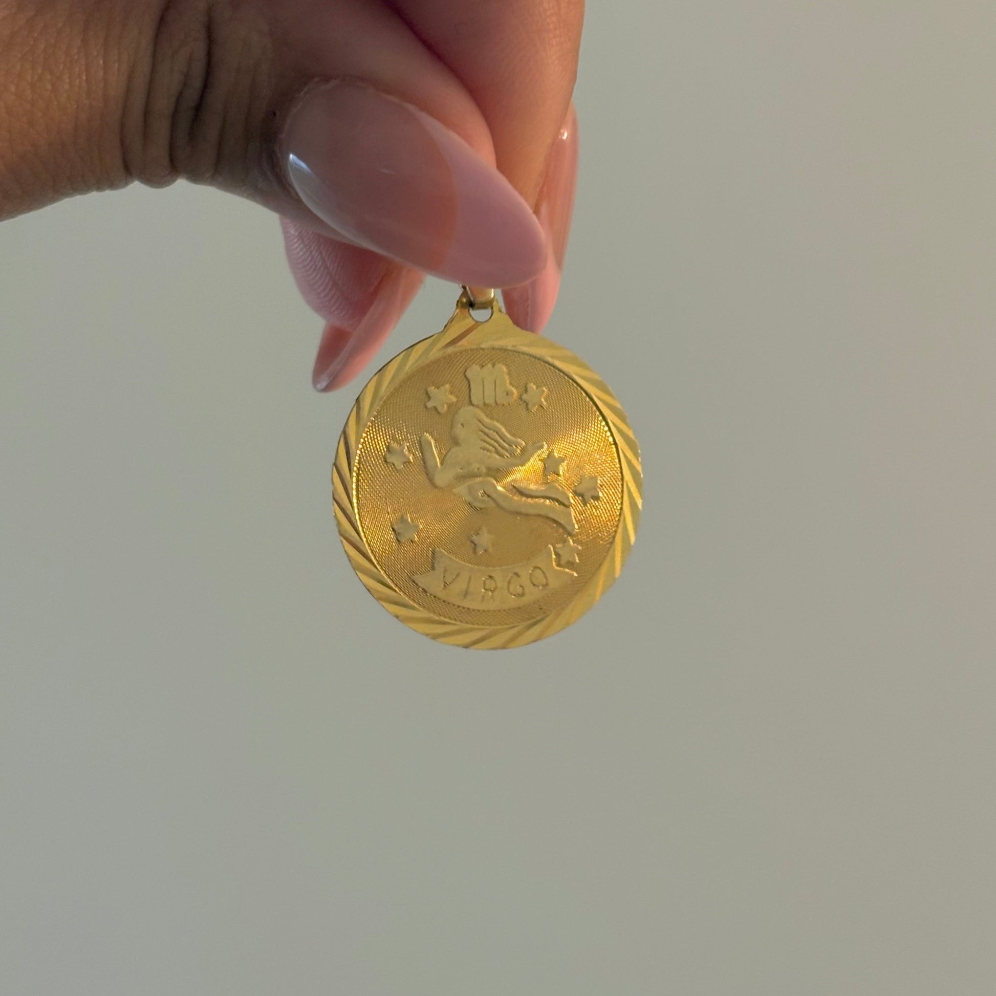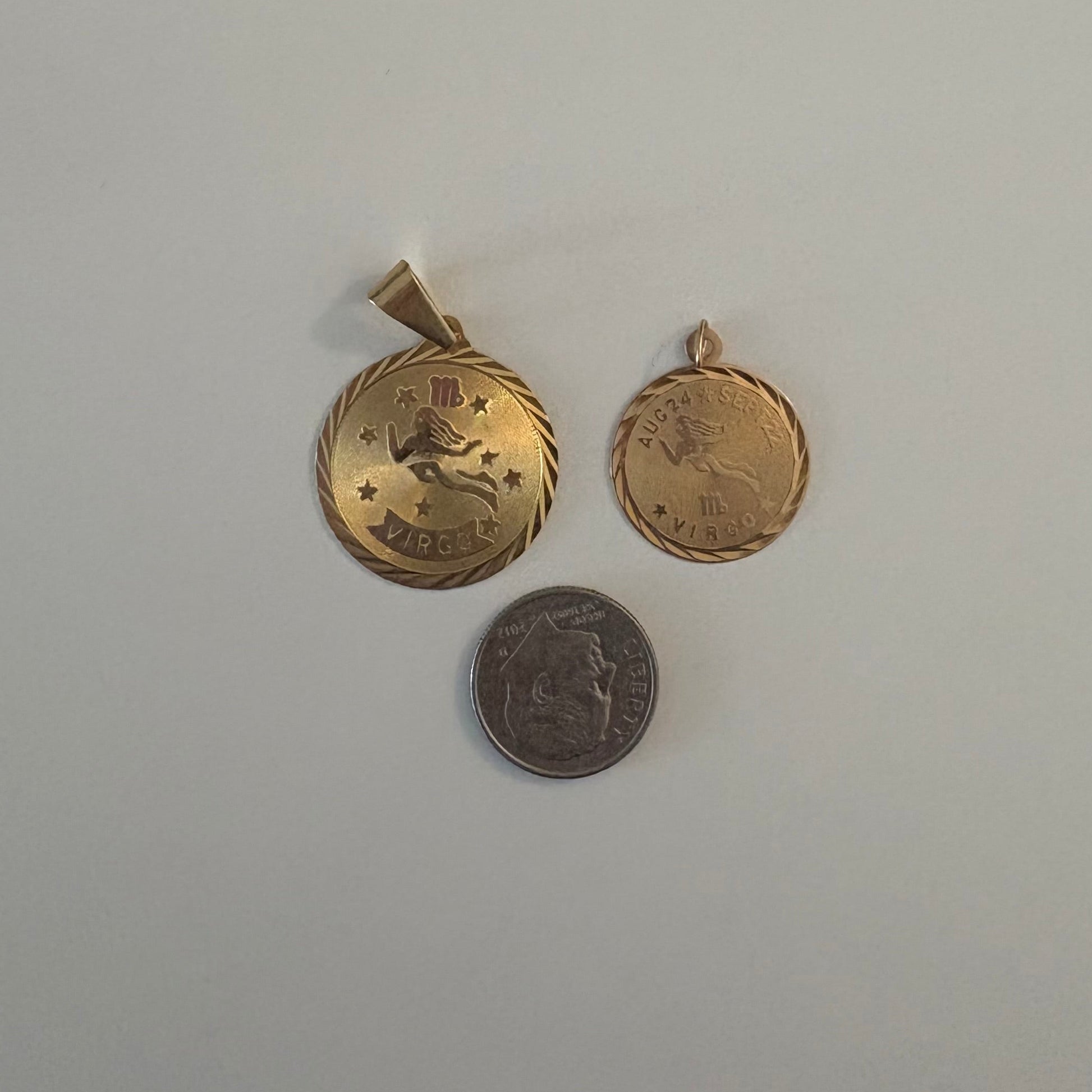 A timeless vintage Virgo zodiac charm, crafted in solid 14K yellow gold and full of celestial detail. Each medallion features the Virgo maiden surrounded by stars, framed with a textured border that gives these charms their classic vintage character.