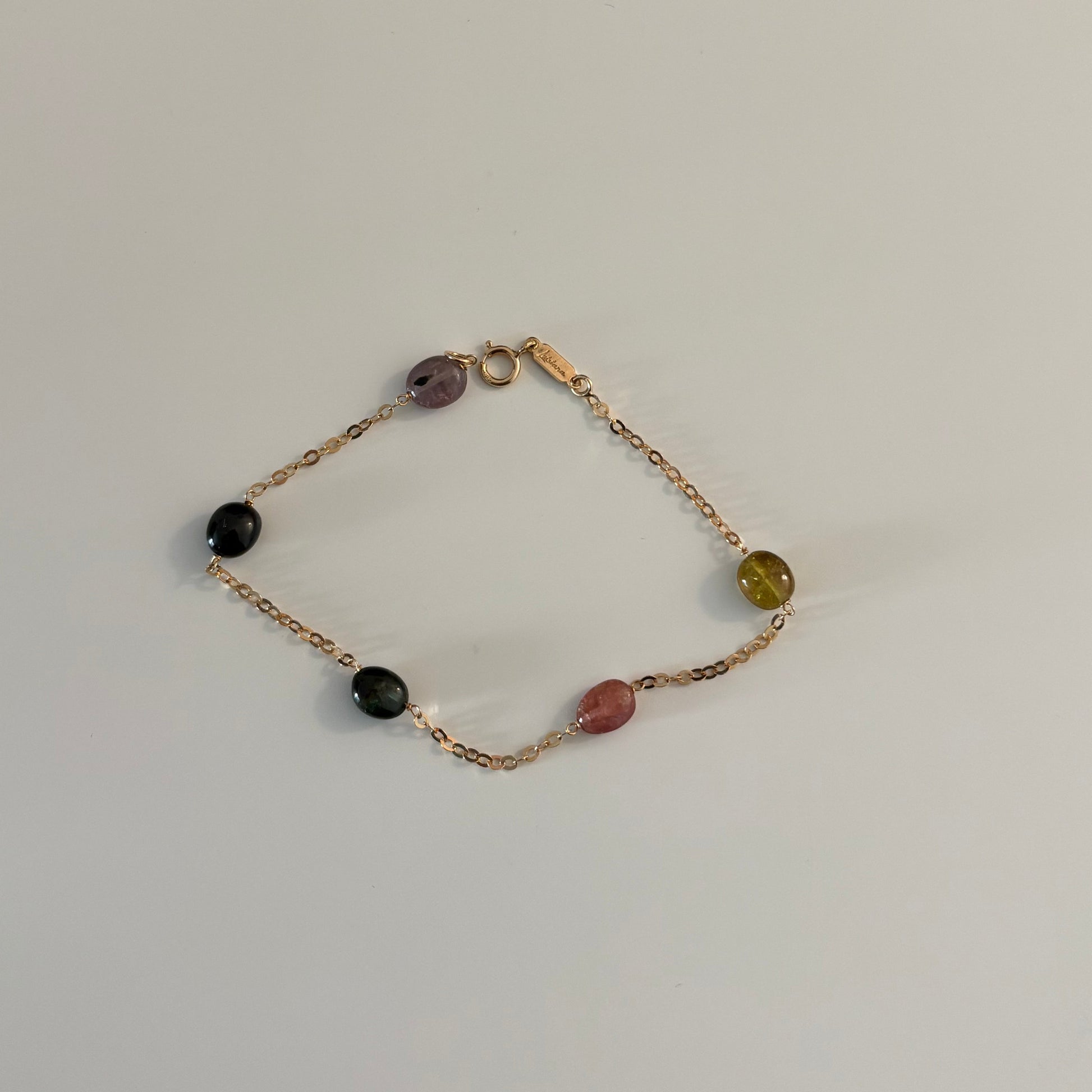A beautiful collectible from the Italian brand Luisiana by Mazzini, known for its delicate goldwork and natural gemstone designs. This vintage bracelet is crafted in solid 14K yellow gold and features genuine multi-color tourmaline stones, each one unique with soft variations of pink, green, lavender, teal, and deep blue.